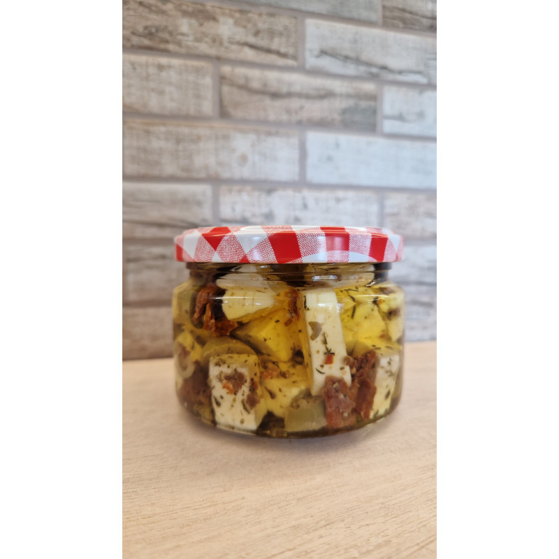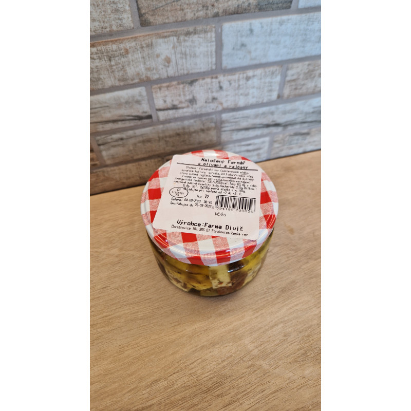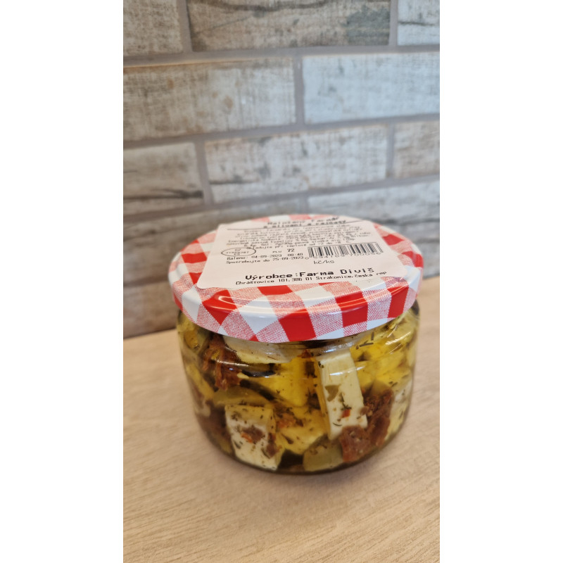 Naložený farmářský sýr s olivami a rajčaty z rodinné farmy Diviš. Celková váha náplně je 230 g, z toho min. 110 g sýru.