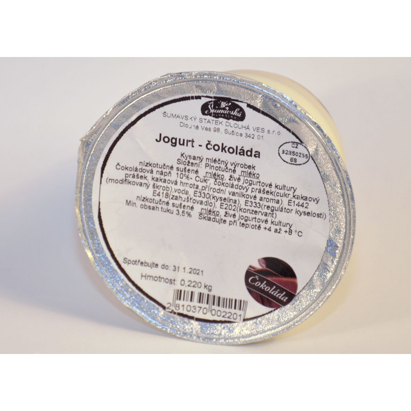 Poctivý plnotučný jogurt s čokoládou z kravského mléka od krav pasoucích se na šumavských loukách.