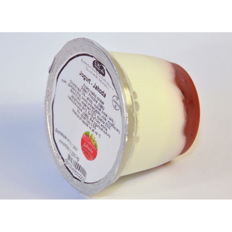 Poctivý plnotučný jogurt s jahodami z kravského mléka od krav pasoucích se na šumavských loukách.