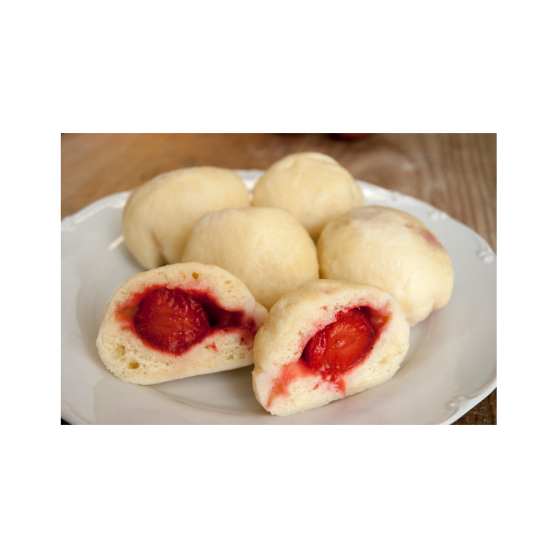Tyto knedlíky jsou vyráběny ze šumavské mouky z mlýna Mrskoš v Horažďovicích, která je vždy čerstvě umletá v nejlepší kvalitě. Knedlíky jsou plněny celými jahodami a při rozkrojení na vás čeká nádherná struktura spojení lahodného těsta a kvalitního ovoce. Z dětství si na skvělou chuť knedlíků s jahodou jistě vzpomenete, když ochutnáte ovocné knedlíky se značkou „Jako od maminky“. Ruční zpracování a kvalitní suroviny dělají z ovocného jahodového knedlíku dokonalou potravinu.