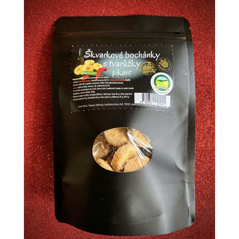 Křupavé škvarkové bochánky s Olomouckými tvarůžky v pikantní verzi. Ruční výroba z Jeseníků, poctivé suroviny a výrazná ostrá chuť.